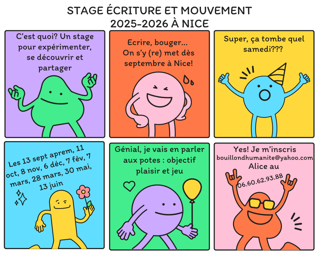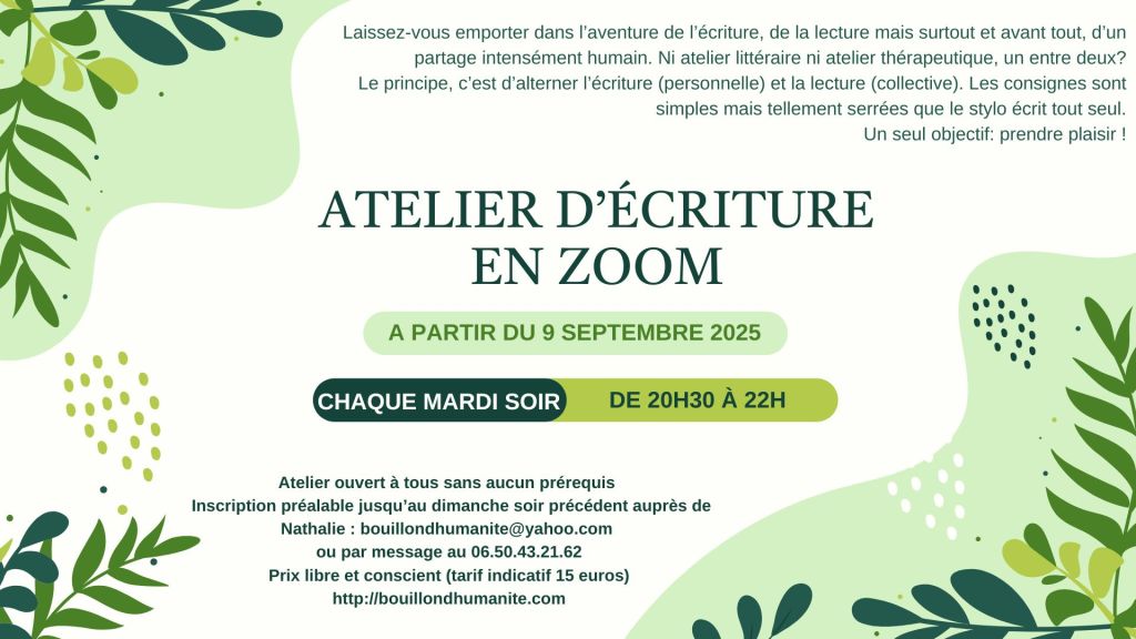 Les ateliers sont actuellement proposés au fil de l’eau, n’hésitez pas à me contacter pour en savoir plus.